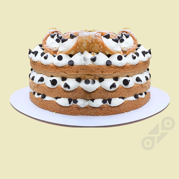 Crumbled cannoli shells, sweet ricotta, chocolate chips, and candied orange between vanilla sponge layers.