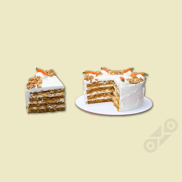 Ingredients: Fresh Carrots, Tipo 00 Flour, Cinnamon, Nutmeg, Free-Range Eggs, Italian Mascarpone DOP, Callebaut White Chocolate, Caramelized Persian Walnuts, White Chocolate Curls, Sugar Fondant