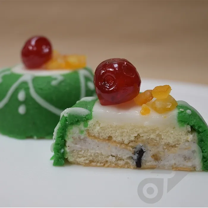 A royal heritage dessert - Sicily’s iconic cake – layers of almond sponge, sweet ricotta, and candied fruits under a emerald-green marzipan dome garnished with icing sugar drawings and dark cherry.